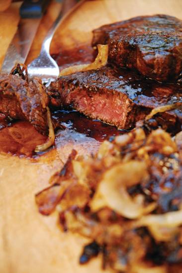 (Filetto Di Manzo Con Riduzione Di Vino Rosso) This is a very simple recipe that looks and sounds much fancier than it is. It’s all about a beautiful piece of meat and a flavorful basic wine reduction. For the meat: ask your butcher to cut it into slices for you, or do it yourself at home before you cook it. The wine reduction should be made in advance so it’s ready to go when the meat is done (the meat can be cooked in minutes). For the reduction, use your favorite full-bodied red wine. I like to serve this with fried fennel.