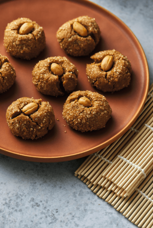 These peanut cookies, called 花生餠 (fā sāng béng), are a popular Lunar New Year staple. In Chinese, the word peanut means “flower born” and peanuts symbolize blooming life and health. They’re also a symbol of prosperity and fertility; hence, their popularity during holiday celebrations. You’ll find peanuts not just in cookies like these, but in candies, savory dishes, and enjoyed as appetizers. Though prized during Lunar New Year, I find myself seeking comfort in these cookies all year long. They’re traditionally made with ground peanuts, but due to the daily whirlwind that is life, I’ve adapted this classic by using peanut butter as a cheat to save time. The cookies carry a hint of warmth from the five spice, while miso introduces an additional depth of umami. Each melt-in-the-mouth bite is deeply satisfying. P.S.: Don’t skip the cute little peanut on top.