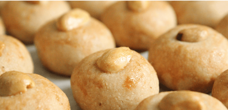 To the center of each ball, press in a whole peanut. Brush all the tops with the egg wash to add shine and color. Bake, rotating the baking sheet halfway through baking, until the tops shine and the edges are browner, 16 to 18 minutes.